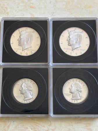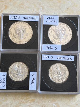 Included are a 1993-S Kennedy half dollar, a 1993-S Washington quarter, a 1996-S Kennedy half dollar and a 1996-S Washington quarter dollar. If you follow USA Coin Book, you will see that these are all fairly priced. I'll also include a 1993-S .900 silver dime. (also proof perfect condition). I'll sell all 5 coins for $120 if you agree to send an additional 5 dollars to help me with shipping.